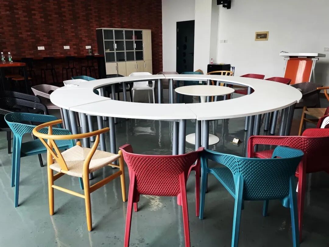 装备投影仪、麦克风、音响等设备,主体部分是圆桌、沙发、吧台,圆桌可拆分成7张小桌,可供项目团队讨论、练习、打磨。