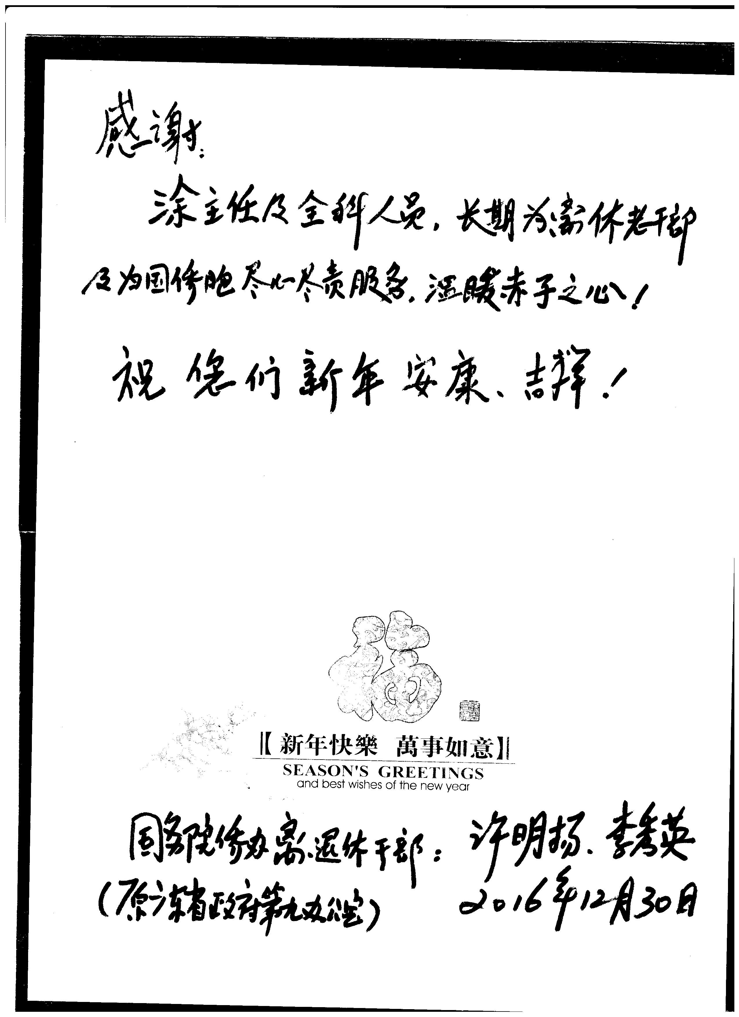 2016年12月30日,我校离退休干部许明扬、李秀英伉俪为感谢公医办全体人员长期为我校离退休干部尽心尽责的服务,送来感谢贺卡。虽然公费医疗管理办公室因工作性质的特殊性,一直是矛盾的结合体,难以被广大教职工理解,但是办公室全体员工一直以饱满的热情紧紧围绕“师生至上、服务第一”的宗旨,努力做好公费医疗服务工作。