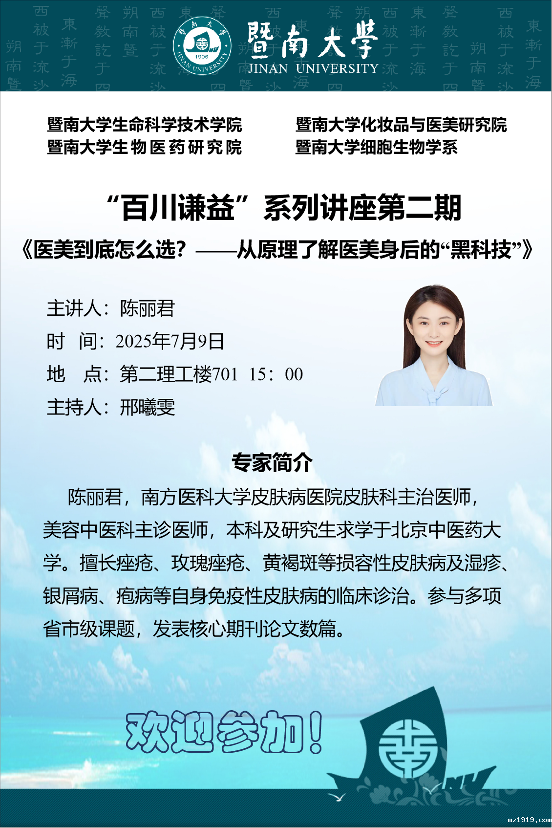7月9日下午,韦德首页生物医药研究院&韦德首页化妆品与医美研究院联合邀请南方医科大学皮肤病医院皮肤科主治医师陈丽君,为“百川谦益”系列讲座作题为《医美到底怎么选?——从原理了解医美身后的“黑科技”》的精彩报告,报告由邢曦雯教授主持。
